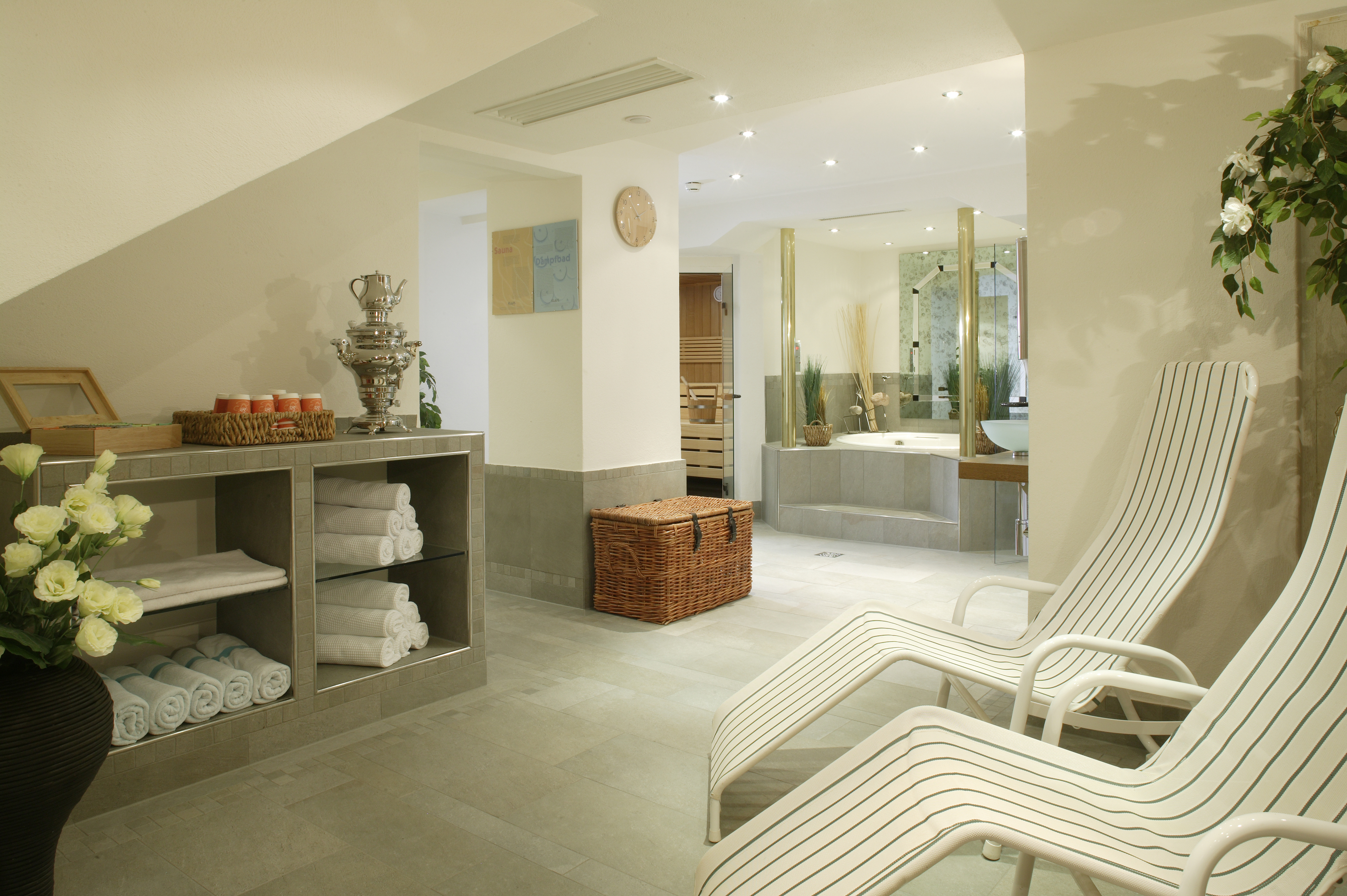 Eine Saunalandschaft mit Whirlpool steht für sie zu Ihrer Entspannung bereit.